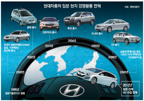 현대차는 1995년 일본 지바(千葉) 현에 기술연구소를 설립한 뒤 2000년 현대차 일본판매법인(HMJ)을 출범하고 ‘아반떼’ ‘싼타페’ 등을 출시했다. 그러나 한국차에 대한 낮은 인식과 일본 ‘빅3’의 아성에 부진을 겪다 10년간 누적 1만5000여 대 판매에 그친 채 2009년 말 승용차 부문을 철수했다. 현재는 연구소와 상용차 사업부만을 남겨두고 있다.