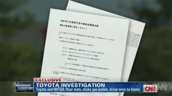 미국 뉴스전문채널 CNN은 지난 2일(현지시간) 토요타자동차의 엔지니어들이 작성한 내부 기밀문서를 입수했다며 이를 공개하고 급발진에 따른 토요타자동차의 주장이 사실과 완전히 다르다고 폭로했다.