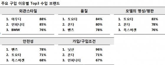 마케팅인사이트는 “벤츠는 ‘안전성’, 토요타와 혼다는 ‘품질’과 ‘모델의 명성/평판’, 아우디는 ‘외관스타일’, 닛산은 ‘가격/구입조건’에서 다른 브랜드를 앞섰다”며 “주요 구입요인에는 들어가지 않지만 ‘연비’는 폭스바겐, ‘엔진 배기량/힘’은 인피니티가 다른 브랜드를 크게 앞서며 차별화 이미지를 갖고 있었다”고 분석했다.