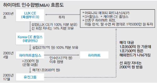 이후 룩스는 또 다른 조세피난처인 네덜란드에 페이퍼컴퍼니 ‘Korea CE 홀딩스’를 세웠다. 이 회사는 다시 2797억 원을 출자하는 방식으로 국내에 하이마트홀딩스를 설립했다. 2005년 4월 하이마트홀딩스는 은행 등에서 2330억 원을 대출받아 5127억 원에 선 회장의 하이마트 지분 14%를 포함한 하이마트 주식 80%를 사들였다. 은행 대출을 빼면 2797억 원에 하이마트를 인수한 셈이다.