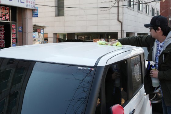 26일 인터넷 동호회 ‘마이레이’ 운영자 전대훈 씨가 ‘레이’의 굴곡현상을 보여주기 위해 지붕을 닦고있다. 사진=김훈기 동아닷컴 기자경기도 파주에서 자영업을 하는 김모 씨(36)는 기아자동차의 신형 박스카 ‘레이’를 계약하고 한 달을 기다린 끝에 지난해 12월 27일 차량을 인도 받았다. 김 씨는 “새 차를 구입한 기쁨도 잠시, 운전석 쪽 지붕 강판이 이상해 자세히 보니 울퉁불퉁 굴곡이 있었다”면서 “정말 어처구니가 없었다”고 말했다.