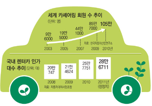 자동차를 장기 임차하는 수요도 늘어나고 있다. 2008년 20만747대였던 국내 렌터카 인가 대수는 2011년 28만6711대로 42.8% 증가했다. 반면 같은 기간 국내 신규 등록 자동차는 1679만 대에서 1843만 대로 9.8% 증가하는 데 그쳤다. 자동차대여사업조합 관계자는 “앞으로 시간 단위로 차를 이용하는 고객은 카셰어링 서비스를, 자가용처럼 장기간 이용하려는 고객은 장기 임대를 선택하는 두 방향으로 시장이 형성될 것”이라고 내다봤다.