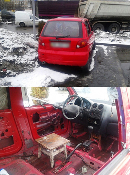 러시아의 한 주차장에서 발견된 것으로 알려진 사진 속 차량은 붉은색 소형차로 외부는 여느 자동차와 별반 다르지 않다. 하지만 내부는 주행에 필요한 최소한의 장비만 갖춰져 보기에도 민망할 정도다.