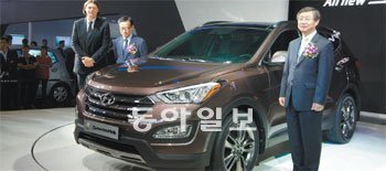 신형 싼타페 공개 양웅철 현대자동차 부회장(오른쪽)이 23일 중국 베이징 국제전람센터에서 개막한 ‘2012 오토차이나’에서 올 하반기에 중국 현지 생산을 시작하는 현대차의 스포츠유틸리티차량(SUV) 신형 싼타페를 소개하고 있다. 현대자동차 제공베이징=이진석 기자 gene@donga.com