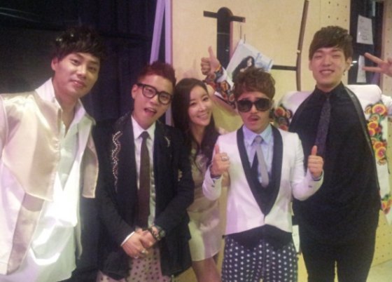 방송인 원자현이 울랄라세션 멤버들과의 기념촬영에서 ‘매너무릎’ 포즈를 취해 눈길을 끌었다.