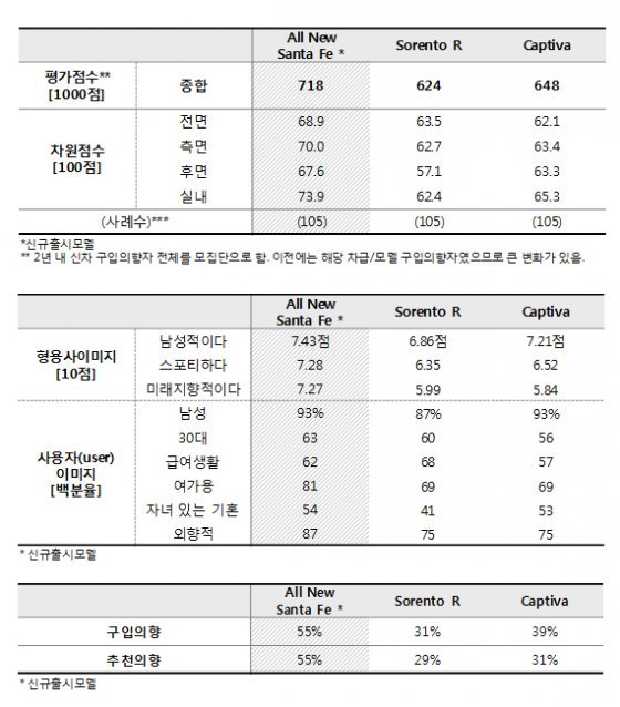 업체에 따르면 ‘싼타페 초기반응조사’에서 전면·측면·후면·실내 디자인을 포함한 평가항목을 1000점 만점으로 설정한 후 동급 차종인 기아자동차 ‘쏘렌토R’과 쉐보레 ‘캡티바’와 비교했다. 그 결과 싼타페가 718점으로 단연 앞섰으며 캡티바와 쏘렌토R이 각각 648점·624점으로 뒤를 이었다.