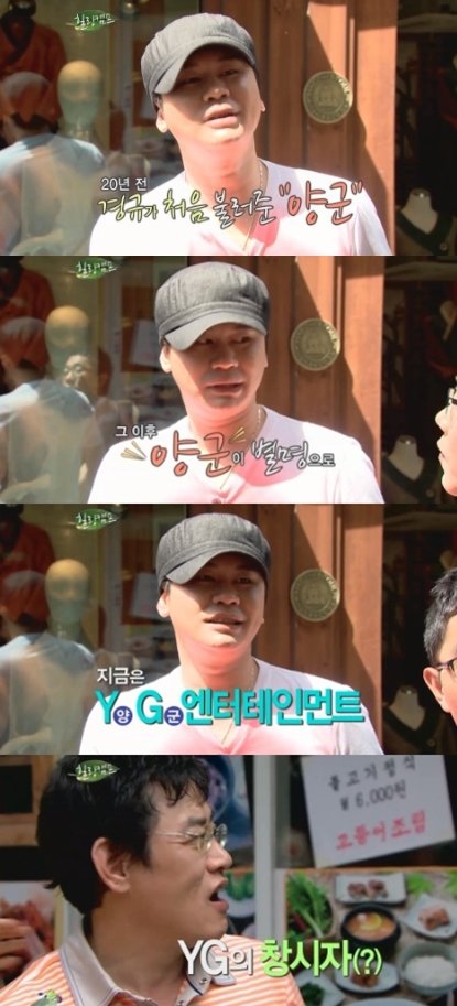 양현석은 “지금 YG엔터테인먼트 이니셜이 양군이란 뜻이다. 이경규 씨는 YG 창시자다”고 덧붙여 웃음을 자아냈다.