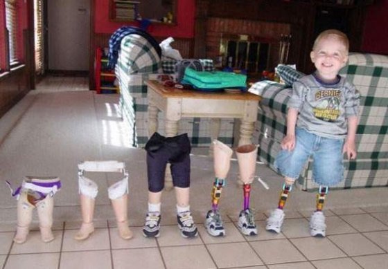 다리가 없어 의족에 의지해 살아가는 한 소년이 성장해 가면서 바꾸게 된 의족을 모두 나열해 둔 것이다. 갓난아이부터 지금까지 의족 5개가 보인다.