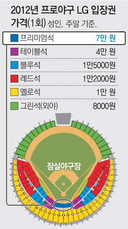 잠실구장 중앙 지정석, 일명 프리미엄석은 약 200석이다. 자리는 한정돼 있는데 이를 원하는 사람들은 급증하는 추세여서 품귀 현상이 빚어지고 있다. LG는 지난해까지 좌석당 280만 원을 받던 프리미엄석 연간권 가격을 올해부터 450만 원으로 대폭 인상했다. 그럼에도 연간권 판매를 시작하자마자 모두 팔렸다.