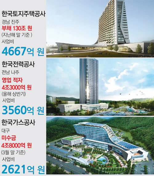올해 상반기(1∼6월) 4조 원이 넘는 영업 손실을 낸 한국전력도 전남 나주 신사옥을 지하 2층, 지상 31층의 14만9372m²(약 4만5229평) 규모로 짓고 있다. 서울 강남구 삼성동에 있는 현 본사 건물(총면적 9만7156m²·약 2만9418평)보다 2만1499m²(약 6509평) 넓다.