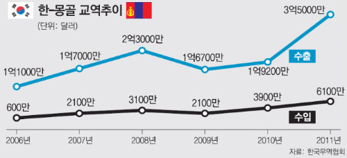 한국과 몽골은 1990년 수교 이후 급속히 가까워졌다. 양국의 교역규모는 1990년 271만 달러(약 29억 원)에서 지난해 4억1000만 달러(약 4400억 원)로 150배 이상 늘어났고, 한국은 중국, 러시아에 이어 몽골의 제3위 교역 대상국으로 자리 잡았다.