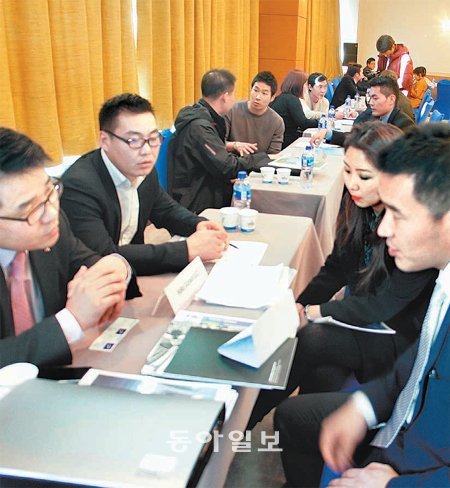15일 몽골 울란바토르 중심가의 블루스카이타워에서 한국과 몽골 기업인들이 투자상담회를 진행하고 있다. 한국무역협회 제공한국무역협회는 이날 몽골과의 교역 확대 및 한국기업의 현지 진출 지원을 위해 상담회를 열었다. 한국에서는 건설·중장비, 자동차 부품, 보석, 식품 등 다양한 분야의 기업 16개사가 참가했고, 몽골에서도 기업 외에 출룬바트 경제개발부 차관, 에르덴부른 건설도시계획부 사무차관 등 6개 부처의 차관급 인사들이 참석해 높은 관심을 나타냈다. 포스코, LG상사, 한라건설 등 한국 기업들은 비즈니스 상담과 시장조사를 병행하는 모습도 보였다.