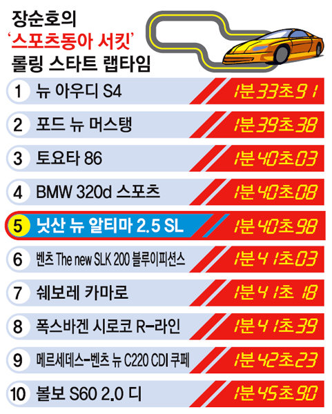 중형차 구입을 고려하고 있는 운전자라면 닛산 뉴 알티마 2.5를 반드시 시승해 볼 것을 권한다. 이유는 2가지다. 뉴 알티마 2.5의 가격은 3350만원으로 경쟁 모델 대비 가격 경쟁력을 충분히 갖췄다. 가격보다 더 중요한 것은 이 차의 성능이다. 아래 서킷 테스트 기록을 살펴보면 닛산 뉴 알티마의 서킷 랩타임이 중위권에 속해 있는 것을 알 수 있다. 중형 패밀리 세단의 서킷 랩타임이 1분40초대라는 것은 차량의 가속력과 제동력, 코너링이 상상 이상의 밸런스를 갖추고 있다는 것을 의미한다.