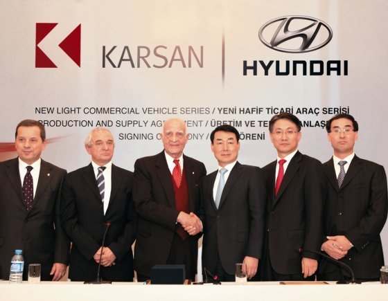 현대자동차는 29일 터키 이스탄불에서 현대차 상용수출사업부장 정영훈 부사장과 터키 상용차 제조업체 카르산(Karsan)社의 이난 키라치 (Inan Kirac) 회장 등 양사 관계자가 참석한 가운데 유럽 전략형 소형 상용차 생산계약을 체결했다고 밝혔다.