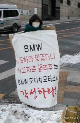 해당 차량 소유주 정 모씨(49)는 지난 7일부터 서울 중구 회현동 BMW코리아 본사 앞에 자신의 파손 차량을 세워놓고 ‘수리를 맡겼더니 사고차로 돌려주나?’라며 1인 피켓시위를 벌였다.