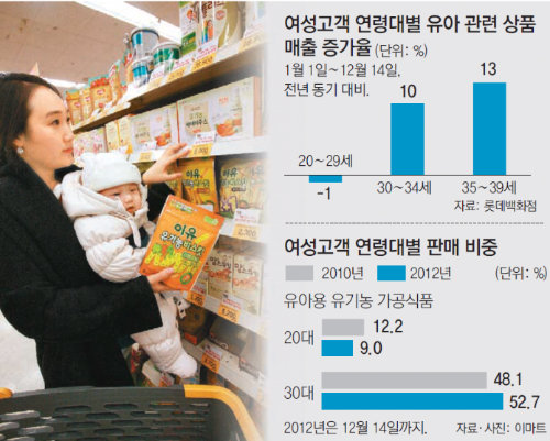 이마트 CRM(고객관계관리)팀에 따르면 이유식 등 유기농 가공식품을 구매한 20대 여성 고객 비중은 2010년 12.2%에서 2012년 9.0%로 줄었다. 반면 30대 여성 고객은 같은 기간 48.1%에서 52.7%로 늘어났다. 노은정 이마트 CRM팀장은 “출산 및 영유아 관련 상품 구매 고객의 평균 연령이 최근 2년 새 0.5세가량 높아졌다”고 전했다.