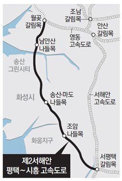 국토해양부는 ‘제2서해안 평택∼시흥 민자고속도로’가 28일 개통된다고 14일 밝혔다. 새 도로는 수도권 서남부에서 충청권으로 바로 이어지기 때문에 기존 서해안고속도로의 정체 해소에 도움이 될 것으로 보인다.