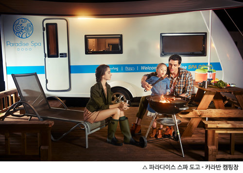 또한, 파라다이스 스파 오토 캠핑장은 4인 가족이 즐길 수 있는 최신형 카라반으로 2층 침대, 더블침대, TV, 전자레인지 침구류와 식기세트 등 기본 시설이 완벽히 갖추어져 있으며, 안전을 위하여 CCTV도 외부에 설치되어 있다. 카라반 웰컴센터에서는 바비큐 그릴과 모닥불 장비 일체를 대여할 수 있고, 숯불, 장작 등을 판매하고 있어 복잡한 캠핑 준비 없이 가족과 즐거운 휴가를 보낼 수 있다. 이용료는 4인 가족 기준 1박에 132,000원(주말 220,000원)이며, 장비 대여는 3만원에 할 수 있다.