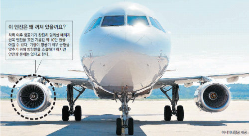 아시아나항공 제공3일 오후 3시 30분 인천국제공항. 일본 센다이에서 날아온 아시아나항공의 A320 항공기가 굉음을 내며 38번 주기장(駐機場)으로 서서히 다가섰다. 그런데 뭔가 이상한 점이 있다. 항공기 왼쪽 날개 아래의 팬은 세차게 돌아가는데, 오른쪽 날개 아래 팬은 바람개비처럼 천천히 돌아가고 있었다. 두 개의 엔진 중 왼쪽 엔진만 가동시켰기 때문이다. 이 비행기는 착륙 후 주기장으로 들어오는 15분간 엔진 하나를 꺼둠으로써 기름값 약 10만 원을 절약했다.