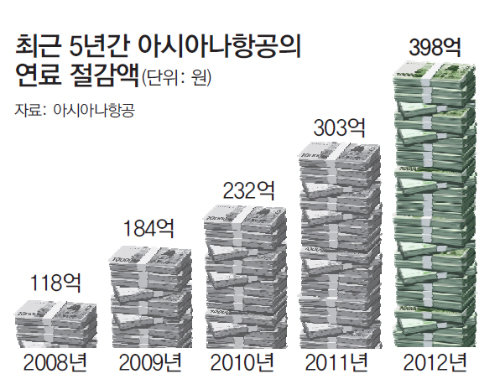 아시아나항공도 마찬가지다. 이 회사는 고유가의 직격탄을 맞은 2008년 직원 10여 명으로 구성된 연료관리 태스크포스(TF)를 출범시킨 데 이어 2011년에는 아예 ‘연료관리파트’라는 조직을 만들었다. 연료 절감 방안을 하나의 조직이 총괄함으로써 나타난 시너지 효과는 컸다. 회사가 자체 추산한 연료비 절감액은 2008년 118억 원에서 2009년 184억 원으로 늘어났고, 지난해는 회사 전체 연료비(2조1362억 원)의 2% 가까운 398억 원을 아꼈다. 장성우 아시아나항공 연료관리파트장은 “현재는 중량 관리, 비행계획, 정비, 운항 등 크게 4가지로 나눠 연료 효율을 높이기 위한 노력을 하고 있다”고 말했다.