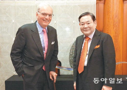 이건희 삼성전자 회장(오른쪽)과 제임스 호턴 코닝 명예회장이 5월 22일 서울 용산구 승지원에서 만나 협력 방안을 논의한 뒤 기념촬영을 하고 있다. 동아일보DB이는 이건희 삼성전자 회장이 “삼성의 5년, 10년 후를 책임질 신수종사업과 소재사업의 경쟁력을 키우는 데 역량을 집중해야 한다”고 강조한 결과로 풀이된다.