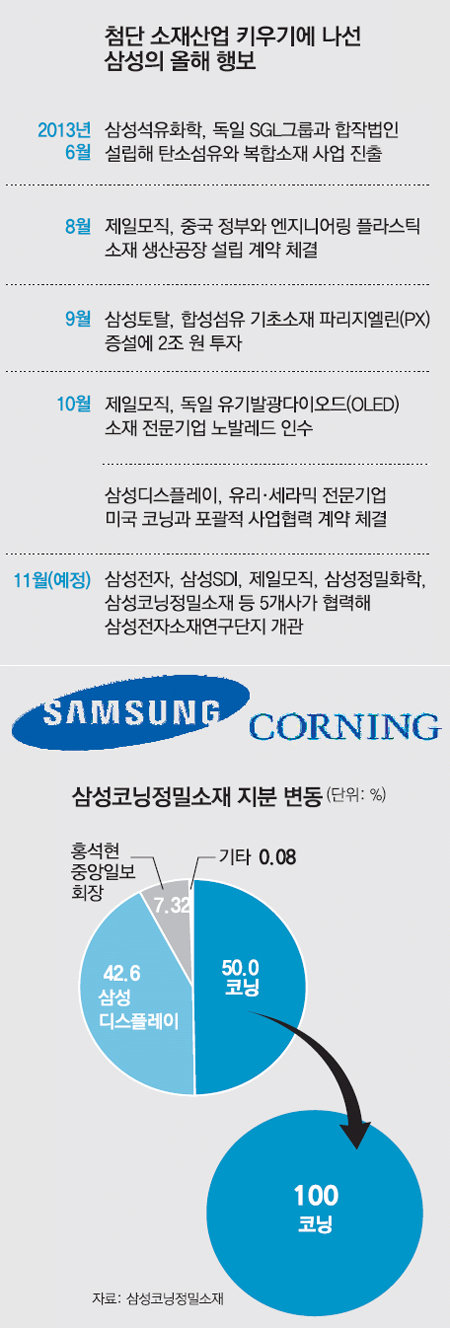 삼성이 최근 제일모직에서 패션 사업을 떼어낸 뒤 세계 최대 규모의 전자소재 전문기업 독일 노발레드를 인수한 것도 소재분야를 강화하기 위한 것이라는 시각이 많다. 과거 비료회사였던 삼성종합화학도 독일 SGL그룹과 합작법인 설립 등으로 탄소섬유와 복합소재 사업에 진출하는 등 변신에 나섰다.