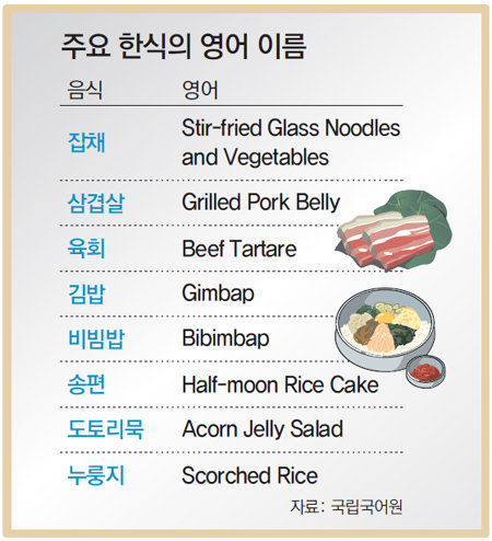 한식식당의 차림표에 나오는 음식의 영어 이름이 이런 식으로 잘못돼 외국인 손님을 당황하게 하거나 조롱거리가 되는 일을 막기 위한 정확한 영어 음식 이름이 나왔다. 국립국어원은 번역 전문가와 각 언어 원어민의 의견을 수렴해 주요 한식 200가지의 3개 언어(영어, 중국어, 일본어) 표준 번역안을 확정했다고 14일 밝혔다. 이 사업은 문화체육관광부, 농림축산식품부와 맺은 업무협정에 따라 추진돼 왔다.