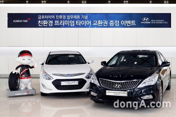 이를 위해 현대차는 금호타이어와 업무협약을 체결하고 7~9월에 쏘나타 하이브리드를 구입하는 고객에게는 ‘에코윙 S’ 그랜저 하이브리드를 구입하는 고객에게는 ‘솔루스 TA31’ 2개를 출고 후 1~3년 내에 무상으로 교체할 수 있는 교환권을 제공한다.