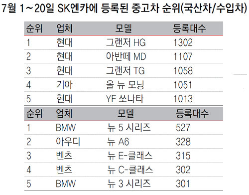 이달 1∼20일 중고차 전문업체 SK엔카에 등록된 중고차 순위를 분석한 결과 그랜저HG는 1302대, BMW 뉴 5 시리즈는 527대를 기록했다. 상반기의 전반적인 추세를 보면 국산차 2위와 3위는 YF 쏘나타와 아반떼 MD가 엎치락뒤치락한 반면, 1위는 그대로였다. 수입차도 2위와 3위는 BMW 뉴 3 시리즈, 벤츠 뉴 E-클래스, 아우디 뉴 A6가 돌아가며 차지했지만 1위와는 멀찌감치 떨어져 있었다. 등록대수 차이도 국산차와 수입차 모두 2위와 3위는 100대 미만이었지만 1위와 2위는 200대 이상 차이가 난 경우가 대부분이다.