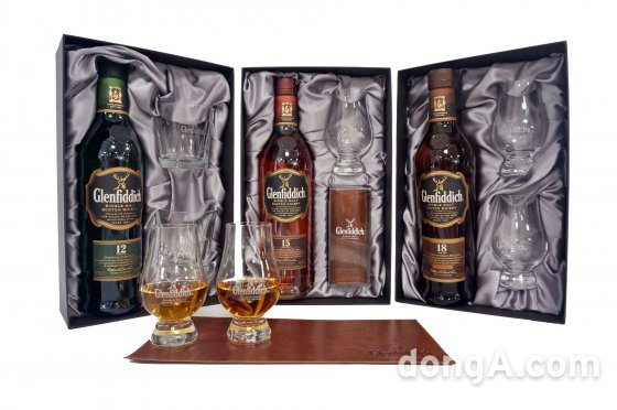 글렌피딕 15년 세트는 글렌피딕 15년 1병과 스코틀랜드에서 직접 수입한 싱글몰트 전용 ‘글렌캐런(Glencairn) 크리스탈 글라스’ 1개, 코스터(컵받침)로 구성됐다. 18년 세트는 글렌피딕 18년 1병과 크리스탈 글라스 2개가 포함됐다. 일명 ‘튤립 글라스’로 불리는 글렌캐런 글라스는 싱글몰트 위스키의 풍미를 가장 잘 표현하는 것으로 알려져 있으며 한 개당 판매 가격은 약 1만5000원이다.