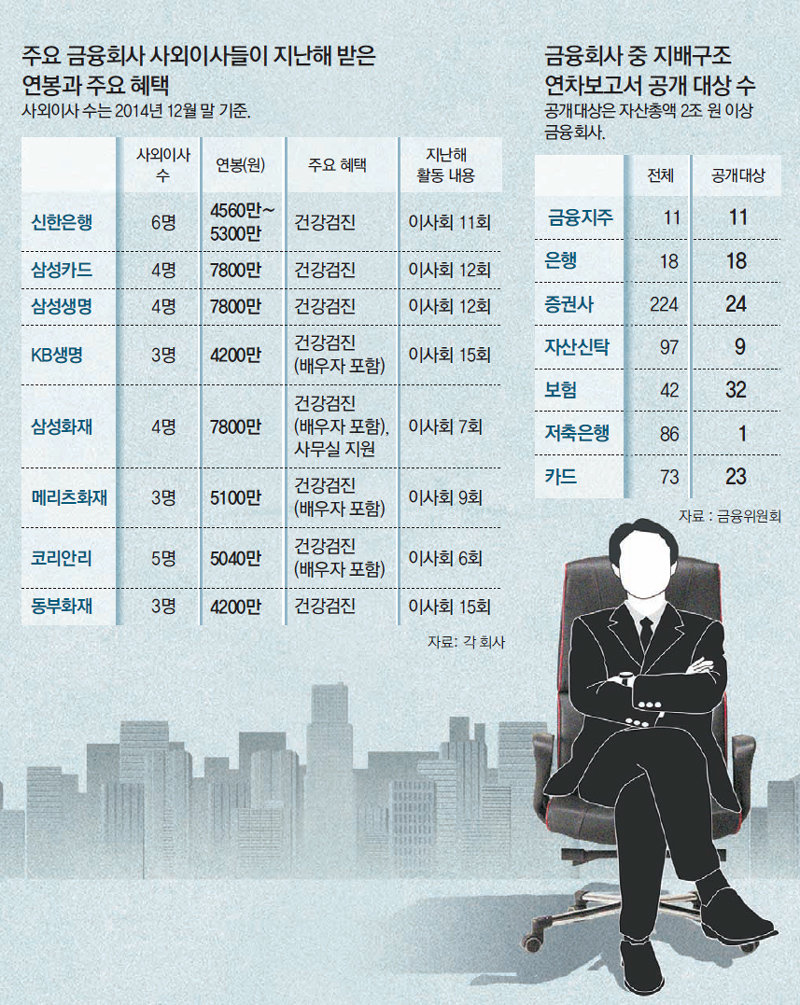 3일 전국은행연합회, 여신금융협회, 생명보험협회, 손해보험협회 등에 따르면 금융회사들은 3월 주주총회를 앞두고 이 같은 내용이 담긴 ‘지배구조 연차보고서’를 관련 협회 홈페이지를 통해 공시했다. 금융위원회는 지난해 말 금융회사의 지배구조 개선을 위해 자산총액 2조 원 이상인 118개 금융회사에 대해 사외이사의 활동 내용과 연봉을 주주총회 20일 전까지 의무적으로 공시하도록 했다. 금융회사들이 사외이사들에 대한 처우 등을 구체적으로 공개하는 것은 이번이 처음이다.