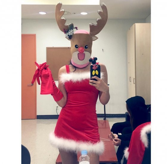 김정민은 20일 저녁 자신의 SNS를 통해 “루돌푸사슴코는 매우반짝이는코~, 가면너무이뻤쩌요, 집에가져오구싶었쩌여”라는 글과 함께 짧은 치마의 산타의상에 루돌프 가면을 쓴 자신의 모습을 촬영한 사진을 공개했다.