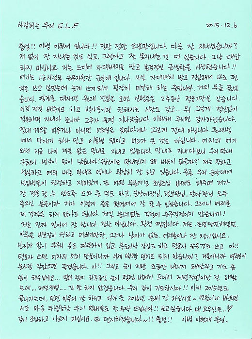 이제 2015년도 끝나가는데, 연말 마무리 잘하시고 다가 올 2016년 준비 잘하십시오. 연말이라 바쁘면서도 마음 뒤숭숭할 우리 멤버들도 잘 부탁드립니다! 보고싶습니다. 내 고무신들. 감기 조심하고 아프지 마십시오. 또 편지하겠습니다. 충성! 이병 이혁재 올림.