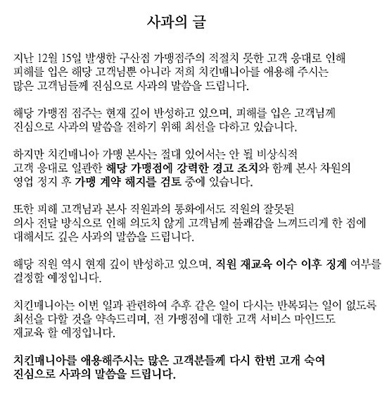 치킨매니아 측은 사과의 글을 통해 “지난 12월15일 발생한 구산점 가맹점주의 적절치 못한 고객 응대로 인해 피해를 입은 해당 고객님뿐 아니라 저희 치킨매니아를 이용해 주시는 많은 고객님들께 진심으로 사과의 말씀을 드린다”고 밝혔다.