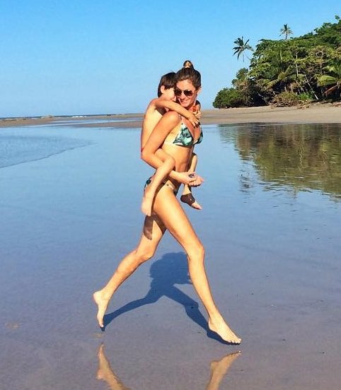 사진 속 지젤 번천은 바닷가 해변에서 아들을 업고 걷고 있다.