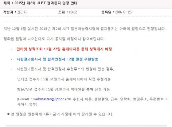 작년 12월 6일 실시된 2015년 제 2회 JLPT 일본어능력시험의 결과가 오늘(27일) 홈페이지를 통해 개시됐다.