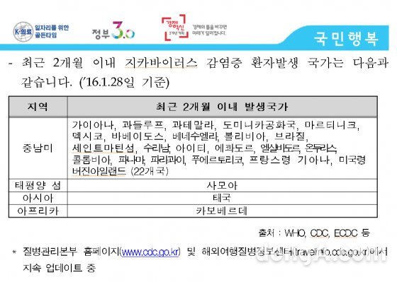 앞서 세계보건기구(WHO)는 지난해 5월 미주 대륙에서는 브라질에서 처음으로 발견된 이후 남미를 중심으로 미주 21개 국가와 지역에 전파됐다고 전했다.