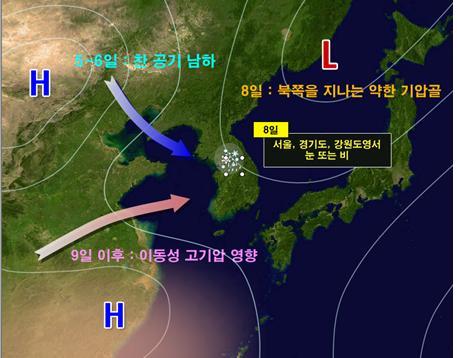 설날인 8일(월)은 우리나라 북쪽을 지나는 약한 기압골의 영향으로 전국에 구름이 많이 끼겠고, 서울·경기도, 강원도영서에서는 눈 또는 비가 내리는 곳이 있겠으며, 기온은 평년과 비슷하겠다.