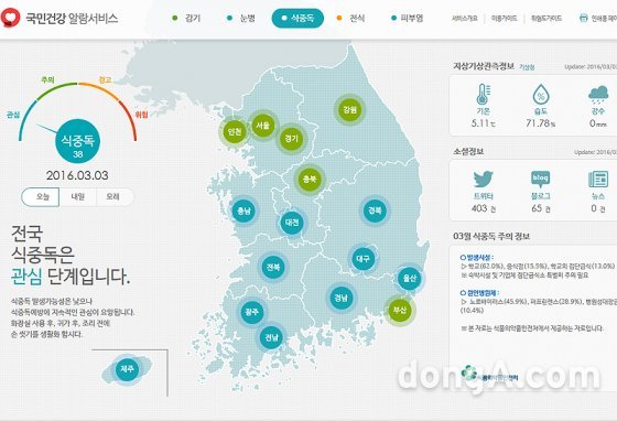 식중독 예측지도. 사진=국민건강보험공단.또한 지난 식중독 발생 정보를 분석하여 월별로 많이 발생한 시설·원인균에 대한 정보와 실시간 기상정보 및 같은 시기 SNS 통계(트위터 등)도 함께 서비스하고 있다.