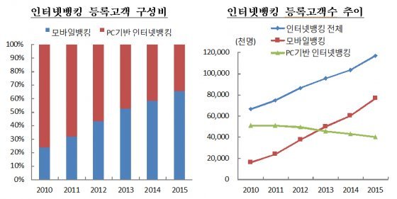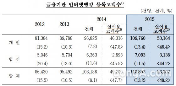 한국은행에 따르면 2015년 말 기준 인터넷뱅킹서비스(모바일뱅킹 포함) 등록 고객수는 1억 1,685만 명으로 2014년 말 13.2% 증가한 것으로 나타났다.