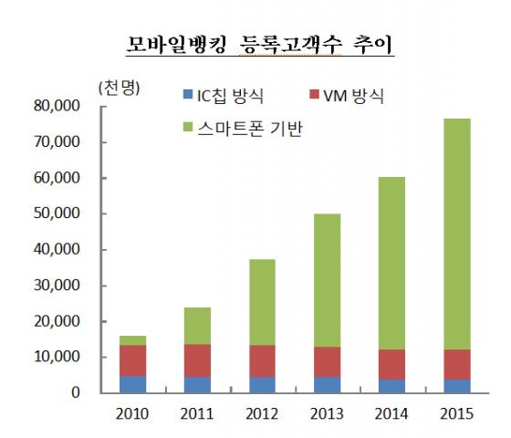 스마트폰기반 모바일뱅킹(이하 스마트폰뱅킹)의 등록 고객수는 6,479만 명으로 전년 말 대비 34.4% 증가하여 전체 증가세를 주도했다.