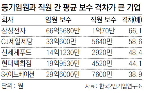 등기임원 및 직원 평균 보수 격차가 15배를 넘는 곳은 42개사로 17.5%에 달했다. 삼성전자가 66.1배로 가장 높았다.