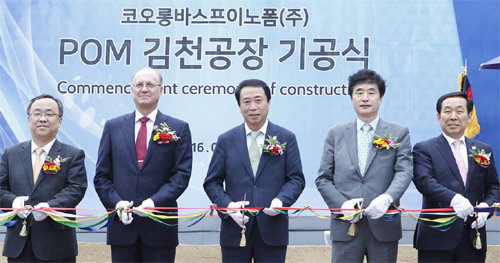27일 경북 김천시에서 열린 코오롱바스프이노폼 공장 착공식에서 안병덕 ㈜코오롱 사장(가운데) 등 참석자들이 테이프커팅을 하고 있다. 코오롱플라스틱 제공코오롱플라스틱과 바스프가 공동으로 설립한 ‘코오롱바스프이노폼’은 27일 경북 김천시에서 EP의 한 종류인 폴리옥시메틸렌(POM) 공장 착공식을 열었다. 신설되는 공장은 2018년 하반기부터 연간 7만 t의 POM을 생산할 예정이다. 기존 시설과 합쳐 연간 15만 t을 생산하는데, 이는 단일 부지로는 세계 최대 규모다.