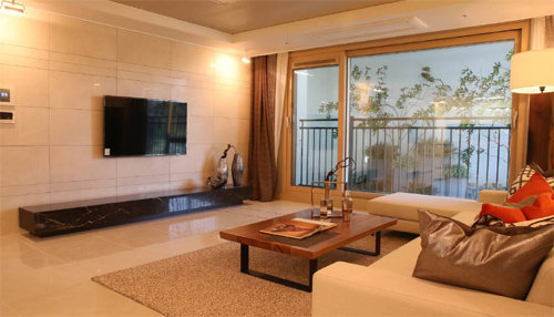 GS건설이 경기 용인시 수지구 동천2지구에서 분양할 ‘동천자이 2차’에는 드레스룸, 팬트리(주방 다용도실) 등 다양한 서비스 공간이 제공된다. 사진은 본보기집에 설치된 전용면적 84A㎡형 거실. GS건설 제공