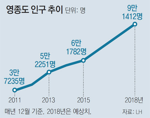 29일 한국토지주택공사(LH)에 따르면 영종도의 인구는 2012년 말 4만2026명에서 지난해 말 현재 6만1782명으로 3년 새 50% 가까이 늘었다. LH는 2018년 말까지 이곳 인구가 9만 명 이상으로 늘어날 것으로 추정한다.