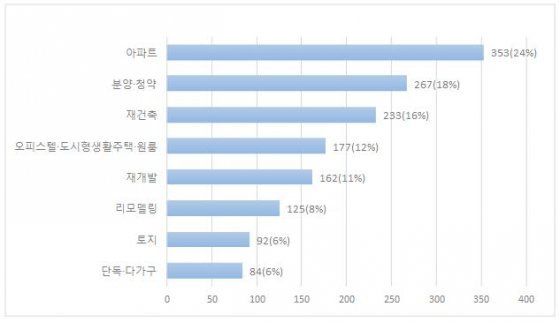 분양·청약(18%)이 뒤를 이었고 △재건축(16%) △오피스텔·도시형생활주택·원룸(12%) △재개발(11%) △리모델링(8%) △토지(6%) △단독·다가구(6%) 순으로 응답 비중이 높았다.