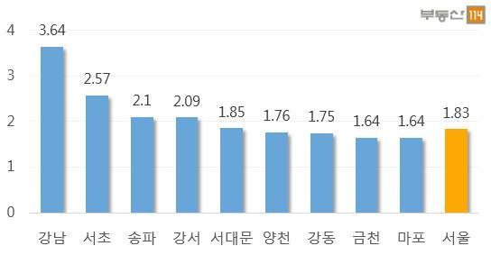 2016년 상반기 서울 구별 아파트 매매가 상승률(자료제공:부동산114)구별 상승률은 9억 원 초과 고가 아파트의 80%가 강남3구(강남·서초·송파구)에 집중됐고 개포지구 등 인기지역 재건축 단지를 중심으로 아파트 값 상승세가 두드러지면서 강남구(3.64%)가 올 상반기 가장 높은 상승률을 기록했다. 이어 △서초구 2.57% △송파구 2.1% 순이었다.