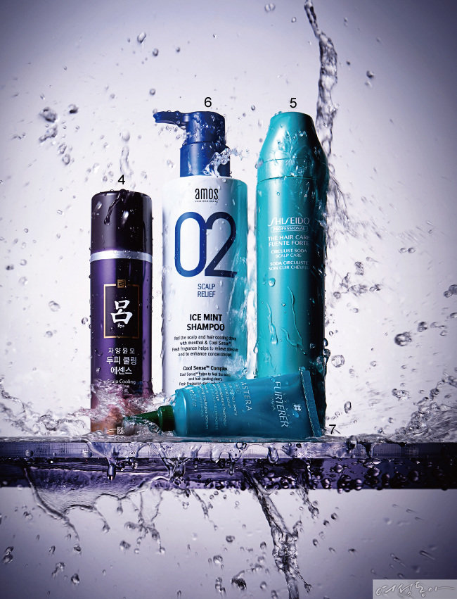 4 려 자양윤모 두피 쿨링 에센스_보글보글한 탄산 에센스가 두피 스트레스를 케어하고 시원한 쿨링감을 준다. 105ml 1만6천원대.5 아모스프로페셔널 아이스민트 샴푸_멘톨과 캠퍼 성분이 두피에 쿨링감과 청량감을 준다. 500g 1만원대.6 시세이도프로페셔널 더 헤어 케어 휀테 포르테 서큘리스트 소다_상쾌한 기분을 선사하는 탄산성 무스로 혈액 순환을 원활하게 하고 두피 스트레스를 풀어준다. 130g 3만6천원.7 르네휘테르 아스테라 프레시 수딩 세럼_아스테라 추출물과 쿨링 에센셜 오일이 사용 즉시 두피 온도를 2.5℃ 내려주는 두피 집중 트리트먼트 세럼. 75ml 2만9천원.4 려 자양윤모 두피 쿨링 에센스