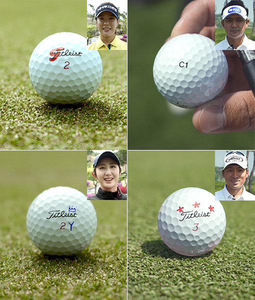 2013년 먼싱웨어 매치플레이 우승자 김도훈(27·신한금융그룹)은 검은색으로 점 하나를 찍고, 매일유업오픈 우승자 모중경(45)은 빨간색 선을 그린다. KLPGA투어에서 통산 8승을 기록 중인 이정민(24·BC카드)은 털털한 성격만큼 마크도 단순하다. 검은색으로 점 3개를 찍어 놓는다. 초등학교 6학년 때부터 쭉 이렇게 마크하고 있다. 이승현(25·NH투자증권)은 라운드마다 마크의 색깔을 다르게 한다. 로고 위에 색깔을 칠하는 게 전부지만, 1라운드 때는 핑크색, 2라운드 주황색, 3라운드는 빨간색을 쓴다. 숫자도 마찬가지다. 1라운드 때는 1번, 2라운드 3번, 3라운드 2번, 4라운드에서는 다시 1번을 쓴다. 대부분의 선수들은 숫자 ‘4’가 새겨진 공은 잘 선호하지 않는다.