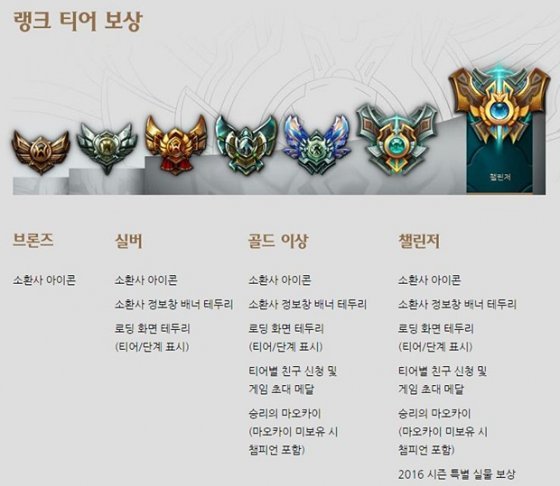 리그오브레전드 2016 시즌 랭크 보상안 (출처=리그오브레전드 홈페이지)LoL 2016 시즌 랭크 보상은 시즌 종료 후 2주 내 지급될 예정이며, 자세한 내용은 LoL 홈페이지에서 확인할 수 있다.